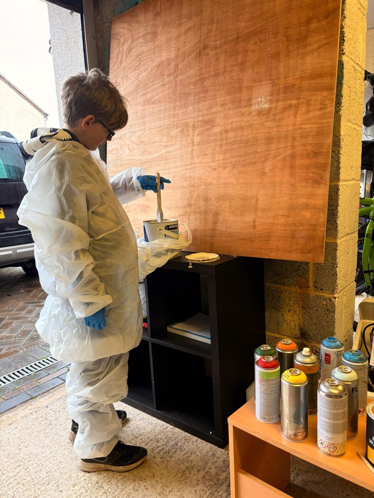 If you’re thinking of using spray paint, make sure the area is well ventilated and you have eye protection and face masks. Gloves and overalls are good to stay clean but you’ve definitely got to look after your eyes and lungs! I get our gear mostly from Graff City who have very good prices on these things.