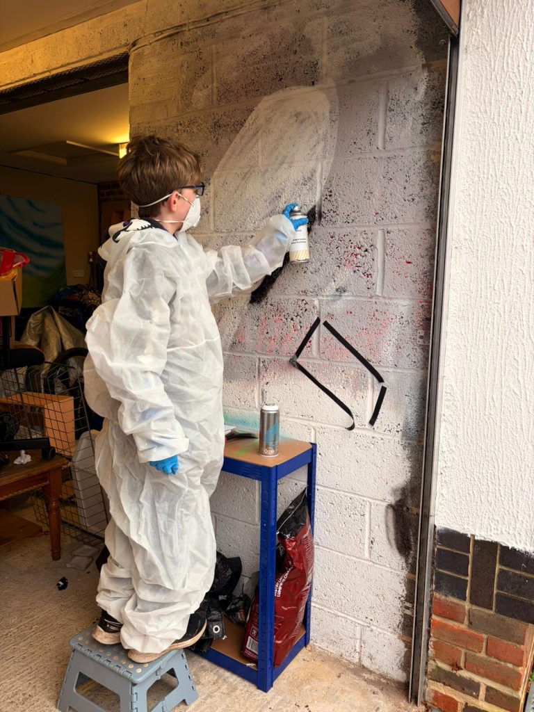 Spray paint is quite tricky to get the hang of. You need to move the can at a steady pace so you get even colour. You have to hold the can at the same distance away as you move so that the lines don’t get wider or skinnier.